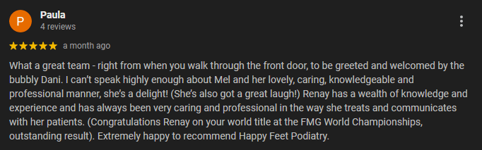 Director of Happy Feet Podiatry, with over 17 years clinical experience. Specialises in biomechanics, sports-related injuries, and children’s foot conditions. Renay also teaches at the University of Newcastle in surgical injection therapy and biomechanics. Her sporting background (competitive swimming, cross-country, bodybuilding) gives her unique expertise in sports injury care.